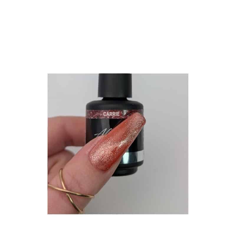 Rose avec des paillettes douces ou un scintillement magnétique d’œil de chat, séduisant et guerrier. Parfait pour des ongles qui captent la lumière sous tous les angles.